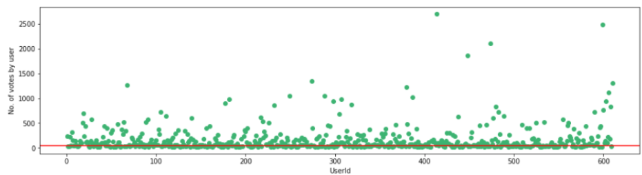f,ax = plt.subplots(1,1,figsize=(16,4))plt.scatter(no_movies_voted.index,no_movies_voted,color='mediumseagreen')plt.axhline(y=50,color='r')plt.xlabel('UserId')plt.ylabel('No. of votes by user')plt.show()