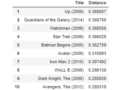 def get_movie_recommendation(movie_name):n_movies_to_reccomend = 10movie_list = movies[movies['title'].str.contains(movie_name)]if len(movie_list):movie_idx= movie_list.iloc[0]['movieId']movie_idx = final_dataset[final_dataset['movieId'] == movie_idx].index[0]distances , indices = knn.kneighbors(csr_data[movie_idx],n_neighbors=n_movies_to_reccomend+1)rec_movie_indices = sorted(list(zip(indices.squeeze().tolist(),distances.squeeze().tolist())),key=lambda x: x[1])[:0:-1]recommend_frame = []for val in rec_movie_indices:movie_idx = final_dataset.iloc[val[0]]['movieId']idx = movies[movies['movieId'] == movie_idx].indexrecommend_frame.append({'Title':movies.iloc[idx]['title'].values[0],'Distance':val[1]})df = pd.DataFrame(recommend_frame,index=range(1,n_movies_to_reccomend+1))return dfelse:return "No movies found. Please check your input"