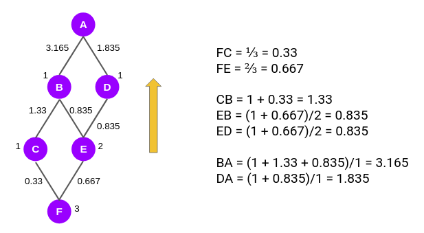 为每个节点分配完分数后,接下来,我们将继续计算边的分数。在这里,我们将向后移动,从节点 F 移动到节点 A: