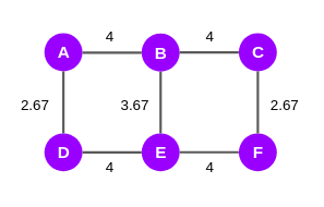 我们首先计算边 FC 和 FE 的分数,正如上图右侧所计算的那样,边 FC 的边缘分数是 C 和 F 的节点分数比率,即 1/3 或 0.33。同样,对于 FE,边缘分数为 2/3。