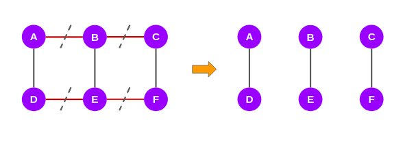 根据 Girvan-Newman 算法,计算 EBC 分数后,最高分的边将被拆分,直到图形拆分为两个点。因此,在上图中,我们可以看到边缘 AB、BC、DE 和 EF 得分最高。我们将删除这些边,得到了 3个子图, 我们可以称之为社区: