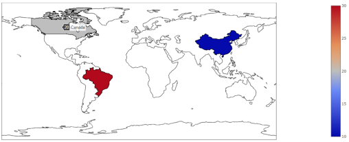 data = dict(type = 'choropleth',locations = ['China','Canada','Brazil'],locationmode='country names',colorscale = ['Viridis'],z=[10,20,30])
