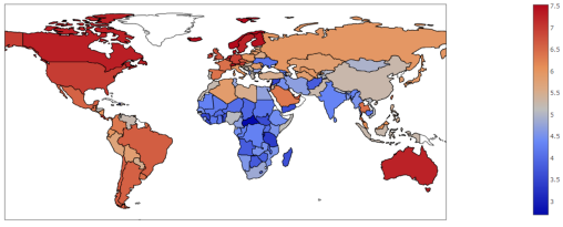 我们可以通过绘制每个国家的幸福指数来让这幅地图变得更有趣,而非任意分配几个国家的幸福指数。根据2017年世界幸福报告的数据集(https://www.kaggle.com/unsdsn/world-happiness),使用下面的代码创建等值域图:
