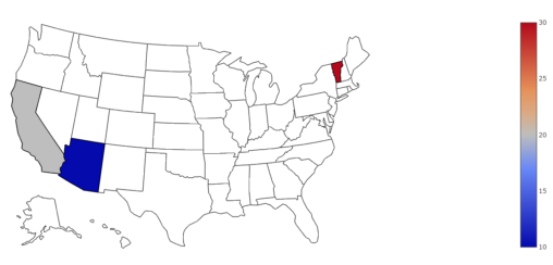 data = dict (type = 'choropleth',locations = ['AZ','CA','VT'],locationmode='USA-states',colorscale = ['Viridis'],z=[10,20,30])lyt = dict(geo=dict(scope='usa'))map = go.Figure(data=[data], layout = lyt)py.offline.plot(map)