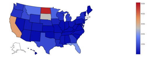 从下地图可以看出,北达科他州是美国蜂群最多的州,其次是加州,美国其他地区还有很大的发展空间。我们还缺少阿拉斯加和右上方的几个州的一些数据,但这是这个数据集的限制,所以我们忽略不计。