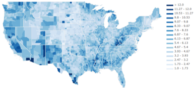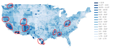 刚才我们已经谈到了幸福指数和蜂群。现在来谈一个比较沉重的话题——失业。我们再细致一点,不考虑国家或州,我们可以画出每个州的各个区。我们