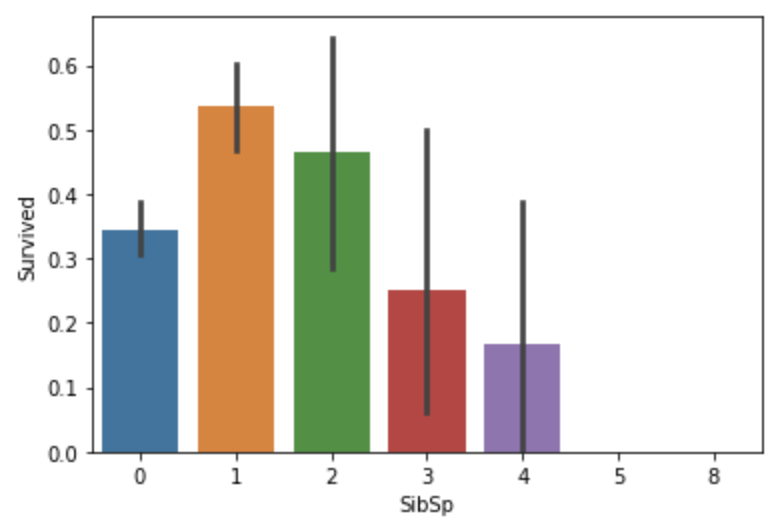 Sibsp features 兄弟姐妹数量在1与2之间的乘客生存率较高。