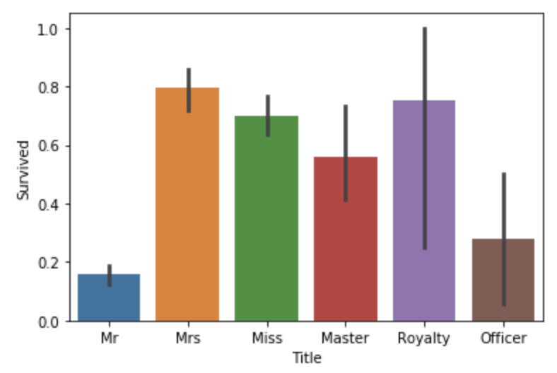 all_data["Title"] = all_data["Name"].apply(lambda x:x.split(",")[1].split(".")[0].strip())Title_Dict = {}Title_Dict.update(dict.fromkeys(['Capt', 'Col', 'Major', 'Dr', 'Rev'],"Officer"))Title_Dict.update(dict.fromkeys(['Don', 'Sir', 'the Countess', 'Dona', 'Lady'], 'Royalty'))Title_Dict.update(dict.fromkeys(['Mme', 'Ms', 'Mrs'], 'Mrs'))Title_Dict.update(dict.fromkeys(['Mlle', 'Miss'], 'Miss'))Title_Dict.update(dict.fromkeys(['Mr'], 'Mr'))Title_Dict.update(dict.fromkeys(['Master','Jonkheer'], 'Master'))all_data["Title"] = all_data["Title"].map(Title_Dict)sns.barplot(x="Title", y="Survived", data=all_data)