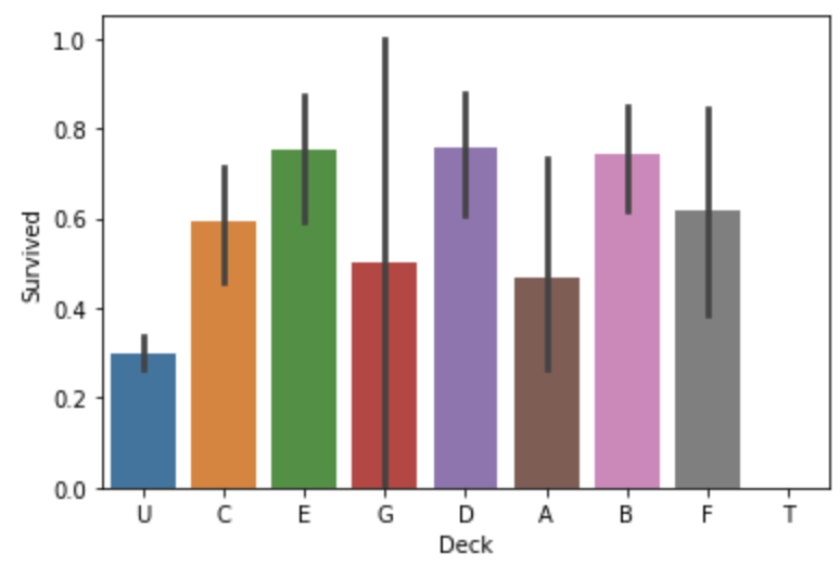 all_data["Cabin"] = all_data["Cabin"].fillna("Unknown")all_data["Deck"] = all_data["Cabin"].str.get(0)sns.barplot(x="Deck",y="Survived",data=all_data)