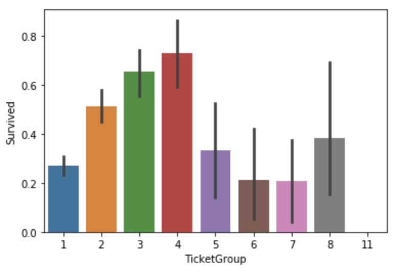 Tick_Counts = dict(all_data['Ticket'].value_counts())all_data["TicketGroup"] = all_data["Ticket"].apply(lambda x:Tick_Counts[x])sns.barplot(x='TicketGroup', y='Survived', data=all_data)