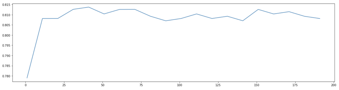 score_list=[]for i in range(0,200,10):rfc = RandomForestClassifier(n_estimators=i+1,random_state=90,n_jobs=-1)score = cross_val_score(rfc,X_train,Y_train,cv=10).mean()score_list.append(score)print(max(score_list),(score_list.index(max(score_list))*10)+1)plt.figure(figsize=[20,5])plt.plot(range(1,201,10),score_list)plt.show()