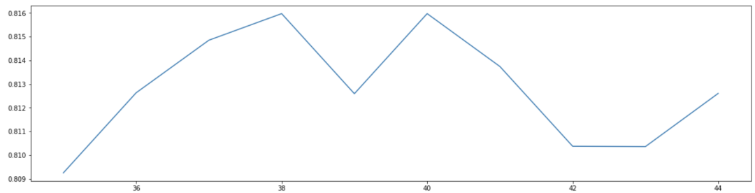 可以观察到,准确率最高值处于35——45之间,继续缩小范围。可以得到当n_estimators 为40时,取得最大值 0.8159760526614461。