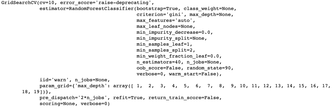 from sklearn.model_selection import GridSearchCVparam_grid = {"max_depth":np.arange(1,20,1)}rfc = RandomForestClassifier(n_estimators=40,random_state=90)GS = GridSearchCV(rfc,param_grid,cv=10)GS.fit(X_train,Y_train)