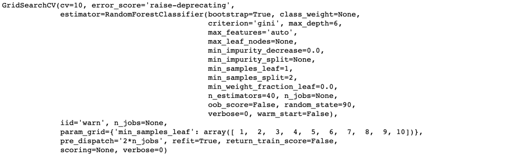 param_grid={'min_samples_leaf':np.arange(1,1+10,1)}rfc = RandomForestClassifier(n_estimators=40,random_state=90,max_depth=6)GS = GridSearchCV(rfc,param_grid,cv=10)GS.fit(X_train,Y_train)GS.best_params_GS.best_score_
