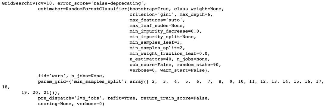 param_grid={'min_samples_split':np.arange(2, 2+20, 1)}rfc = RandomForestClassifier(n_estimators=40,random_state=90,max_depth=6,min_samples_leaf=3)GS = GridSearchCV(rfc,param_grid,cv=10)GS.fit(X_train,Y_train)GS.best_params_GS.best_score_