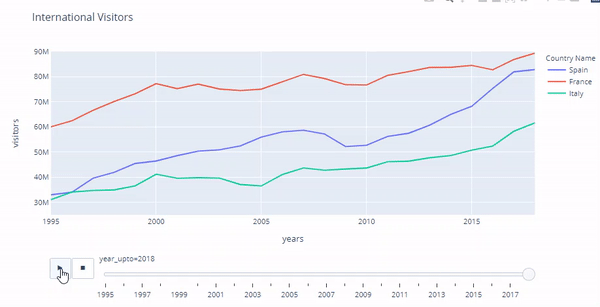 #然后我们将“year_upto”作为animation_frame参数px.line(spfrit,x =“ years”,y =“ visitors”,color =“ Country Name”,title =“ International Visitors”,range_x = [1995,2018] ,range_y = [25000000,90000000],animation_frame =“ year_upto”)