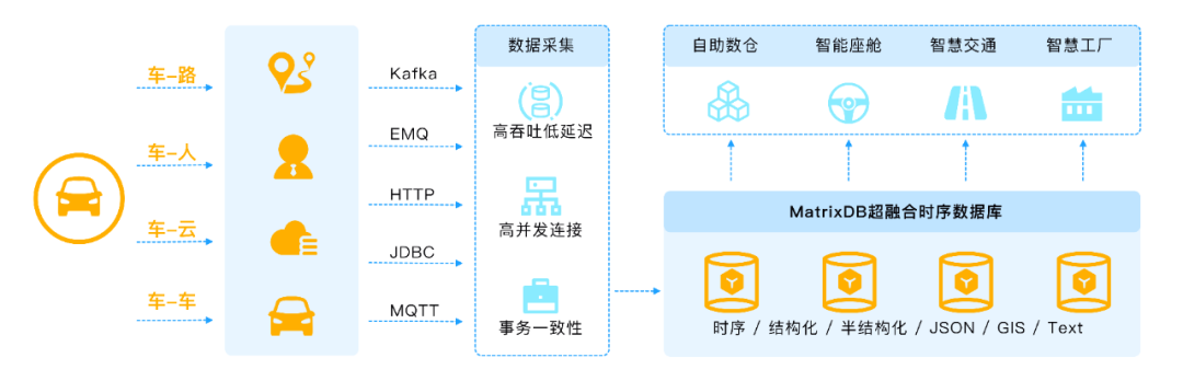 智能网联汽车越来越多的和数据库产生关联,在新能源造车新势力的快速发展下,年增长超过200%的汽车销量仍持续走高,数据架构已无法支撑快速增长的数据及业务量,透过每辆车的传感器把采集的数据实时插入到 MatrixDB 里,可以支撑智能座舱,行为分析、画像预警及数据集市等多种业务需求。
