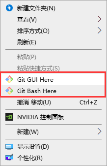 双击git.exe文件来安装git(一直点下一步,直到完成),在Windows桌面空白地方右键能看到如下两行即表示git客户端安装成功。