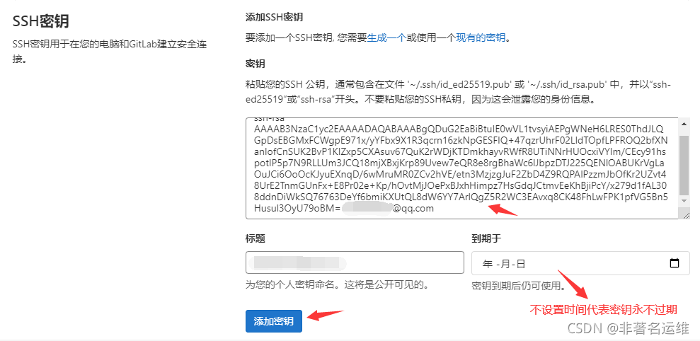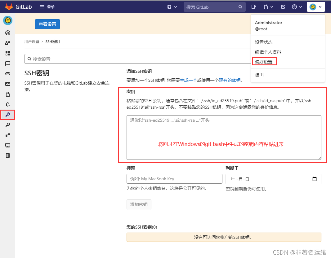 3.3 登录gitlab,找到Profile Settings-->SSH Keys--->Add SSH Key,并把上一步中复制的密钥内容粘贴到Key所对应的文本框中。