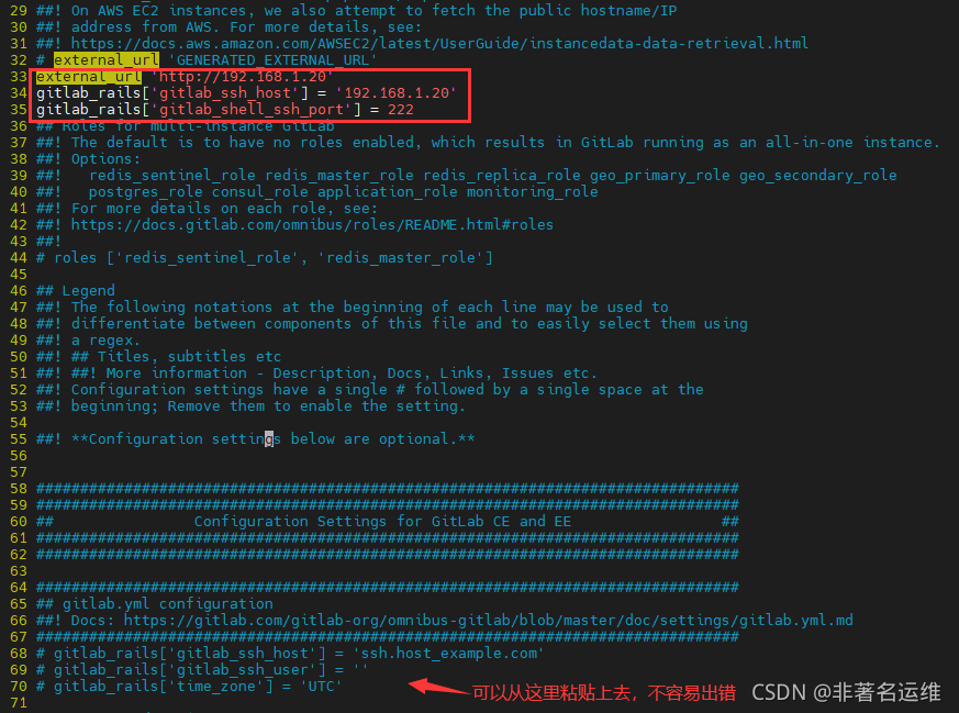 [root@k8s-node2 ~]# vim /home/gitlab/config/gitlab.rb //gitlab.rb文件内容默认全部注释 ... ... 32 # external_url 'GENERATED_EXTERNAL_URL' 33 external_url 'http://192.168.1.20' //配置http协议所使用的gitlab访问地址,可以写域名。如果端口不写的话默认为80端口 34 gitlab_rails['gitlab_ssh_host'] = '192.168.1.20' //配置ssh协议所使用的访问地址和端口 35 gitlab_rails['gitlab_shell_ssh_port'] = 222 //此端口是docker run时22端口映射的222端口 36 ## Roles for multi-instance GitLab
