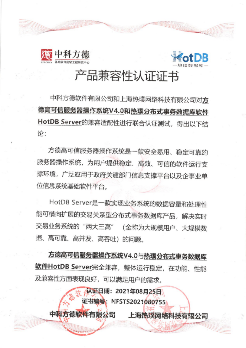 历经严格测试得出结果:热璞数据库产品HotDB Server 、HotDB Cloud 与中科方德可信服务器操作系统可完全兼容,整体运行安全稳定,兼容性良好,功能表现优异且性能卓越,可很好的满足双方客户的极致需求。此次双方互认成功,是强强联合的开始,未来双方将充分发挥各自的产品优势及行业影响力,积极推动信创生态建设,全面助力国产化产品体系高质量发展。在服务共同客户方面,将为企业用户提供更加安全高效、稳定可靠、极致性能、降本增效的行业解决方案,充分有力的保证用户数据安全,为数字化背景下,传统企业快速实现数字化转型保驾护航。我国现阶段大力推进信创生态建设,在整个信创产业链条上,芯片、操作系统等硬件设备依然举足轻重,但随着全球数字化的到来,国产基础软件的地位已同等重要,其中数据库作为核心业务系统的基石,在业务需求中起着关键性指标的作用。热璞坚持自主研发分布式数据库产品HotDB十余年,是国内领先的分布式事务数据库与关系型云数据库厂商,其产品HotDB Server与HotDB Cloud 已完全具备成熟稳定的金融级与工业级两种产品特性,且完全满足金融行业客户对数据库关键性指标的要求。同样,作为“基础软件国家工程研究中心”项目法人单位,中科方德以保障国家党政军及重大行业信息系统安全、发展基础软件为己任,致力于提供可以信赖的国产操作系统产品、解决方案和服务。如上述所说,信创生态建设是一个完整的产业链建设,里面涵盖硬件、软件与服务,因此为了更好的推动信创生态发展,各企业除了不断加强自身发展外,更要注重与上下游企业的合作,不断扩大生态圈。目前,热璞数据库HotDB产品已成功完成了包括龙芯处理器、兆芯处理器、海光处理器、海思处理器、飞腾处理器、鲲鹏处理器;中科方德操作系统、中标麒麟操作系统、统信UOS操作系统;曙光天阔服务器、中科可控服务器、华为TaiShan服务器等在内的众多国产化基础设施的兼容互认。 未来,热璞数据库将不断加强产品创新,紧密携手更多合作伙伴,积极推动上游厂商完成产品兼容性互认,打造安全可控的国产化解决方案。热璞数据库,一家专注基础软件分布式事务数据库和关系型云数据库产品的研发厂商,产品定位于专注OLTP业务场景。创始团队自2004年便开始分布式事务数据库的研究,核心人员来自阿里巴巴去IOE核心团队,并在开源社区主导设计研发MySQL官方读写分离产品MySQLProxy、阿里巴巴Cobar开源分布式数据库、开心农场Gaia分布式数据库、中国联通DaaS分布式数据库平台、MyCAT开源分布式数据库。历经十余年打磨,热璞数据库已从当初第一个产品的萌芽发展成为今天拥有数百家客户的知名企业。现热璞数据库HotDB产品已成功应用于国家开发银行、华夏银行、浦发银行、交通银行信用卡、印尼金光金融集团、世界上第一个无人自动化码头洋山港四期、国家卫生健康委人口与发展研究中心、国家卫生健康委能力建设和继续教育中心、国家电网、中国核电、圆通速递、顺丰科技、中国移动在线、中国移动苏州研发中心、北京移动、上海电信、南京市民卡、江苏省一卡通、央视国际等近百家客户。并承担完成了工信部信息通信研究院、全国金融标准化技术委员会行业标准的主导与编写。中科方德软件有限公司成立于2006年,是“基础软件国家工程研究中心”项目法人单位,该中 心是目前基础软件领域唯一的国家级工程技术研究中心。作为国内为数不多的长期投身操作系统产 业发展的企业,中科方德以保障国家党政军及重大行业信息系统安全、发展基础软件为己任,致力 于提供可以信赖的国产操作系统产品、解决方案和服务。中科方德依托中国科学院软件研究所多年来在操作系统方向的技术积累,在核高基国家重大专 项等支持下,在系统安全性、虚拟化技术、大数据处理等方向获得技术突破,建立了成熟的服务器 操作系统、安全操作系统及桌面操作系统系列产品线,并围绕信息安全、云计算等领域,重点服务 于电子政务、国防军工、教育、能源交通等重点行业。