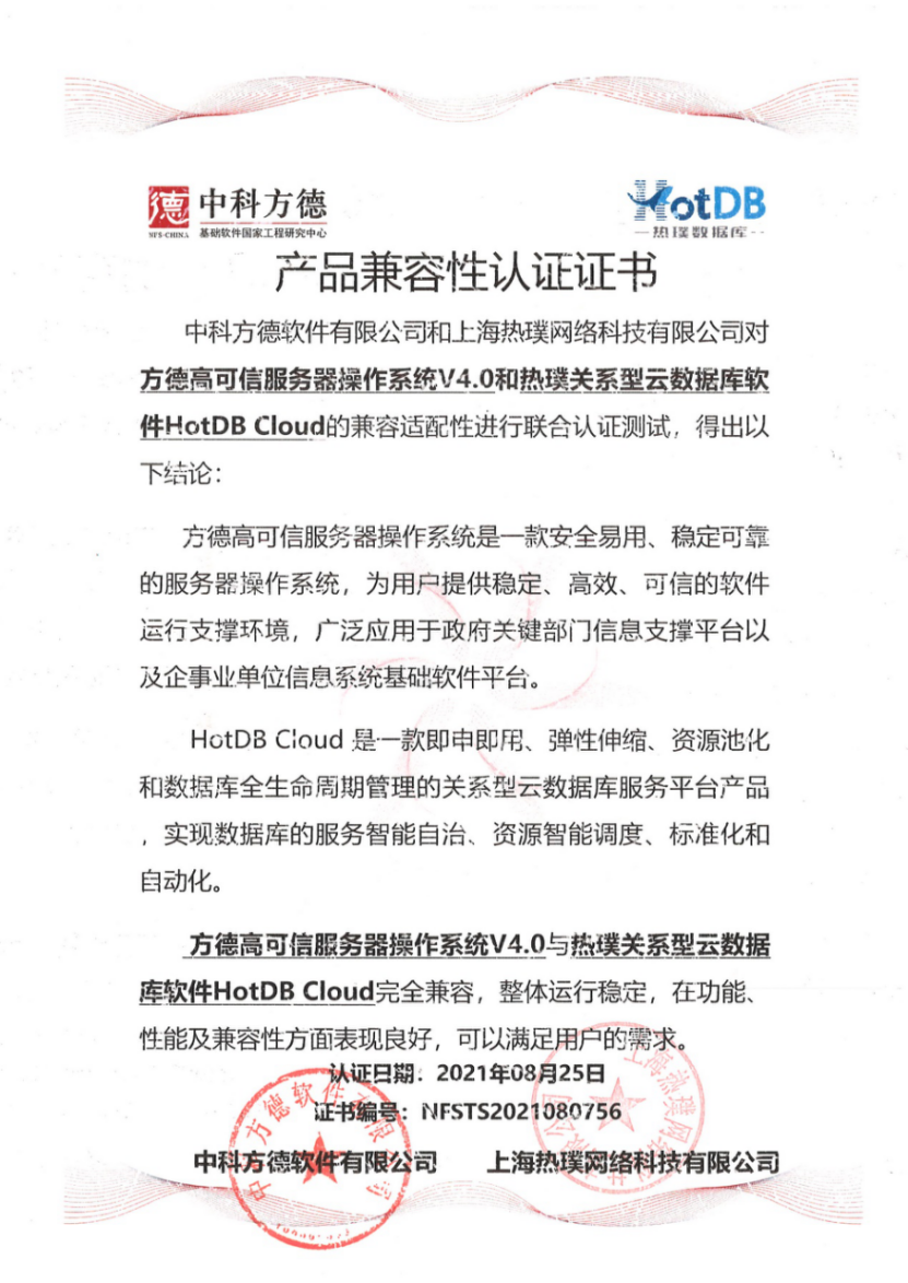 近日,上海热璞网络科技有限公司(以下简称“热璞数据库”)自主研发的国产基础软件分布式事务数据库产品HotDB Server、关系型云数据库产品HotDB Cloud 与中科方德软件有限公司(以下简称“中科方德”)高可信服务器操作系统完成兼容性互认。
