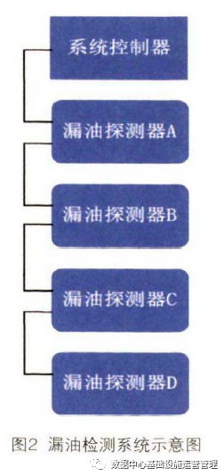 漏油检测系统通常由漏油检测绳、漏油探测器及系统控制器( DDC或PLC ) 组成,系统示意图如图2所示,漏油探测器(A\B\C\D ) 的信号来自于对应的漏油检测绳(A \B\C\D ) ,当任何位置出现漏油事故时,漏油检测绳自动识别漏油位置所在,可将信号反馈给漏油探测器。