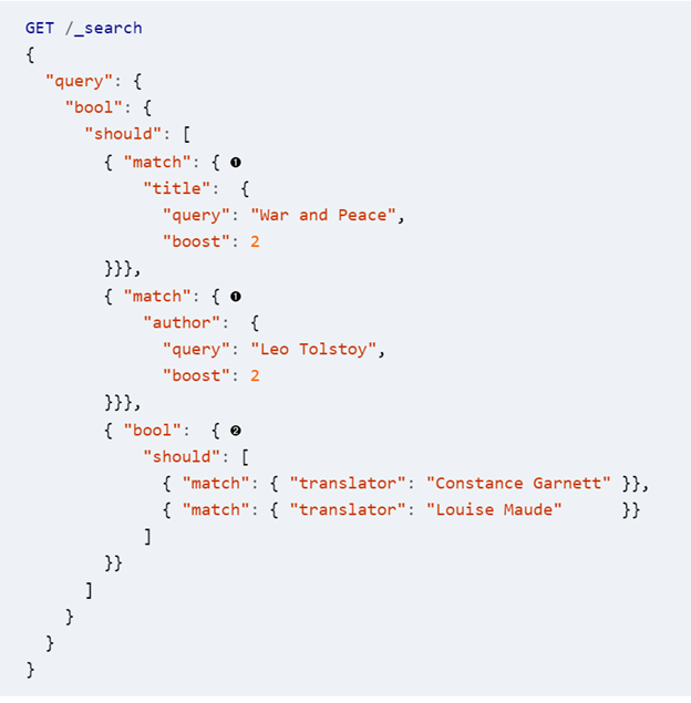 同样是使用bool来处理,这里你可能会问为什么需要在里面再嵌套一个bool的语句,为什么不把它们四个条件放在一个平行的维度。这里就涉及到一个分数的计算细节了。我们主要希望翻译作者这个条件所占的比重只有三分之一,也就是说和书名以及作者是同等的重要。假如我们把两条翻译的作者match放到同一个层级,那么书名和作者其实就只剩1/4的比重了,而每个翻译的作者则各占1/4的比重,这显然不是我们想要的结果。