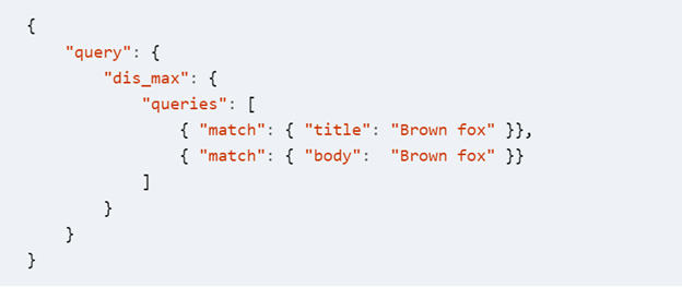 所以这个时候把两个match平等地对待其实好像不是太合理。我们解决这个问题的一个办法就是不管title还是body,谁匹配的好,我就相信谁,也就是说取两者的最高匹配值。这可以使用dis_max来实现,具体查询如下所示: