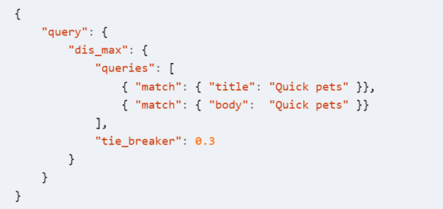 然后使用这种max的处理就意味着我们在最大值相等的情况下,会丢失下一个层级的比较。比如说我们现在搜索quickpets,这两本书都不能完全匹配,第一本书只有title匹配quick,body完全没有匹配,而第二本title匹配了pet,body也匹配了quick。我们显然希望第二本书的返回分数要高一点,但是假如我们只使用上面这种dis_max的处理方法,就会得到两个完全一样的分数。那这个问题如何解决呢?如下所示: