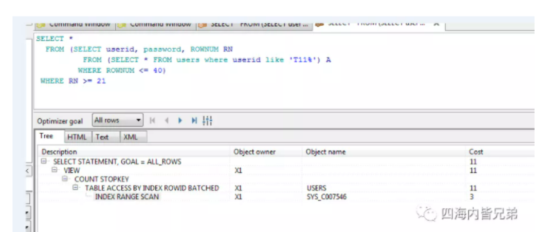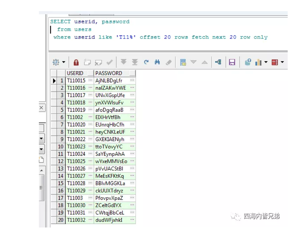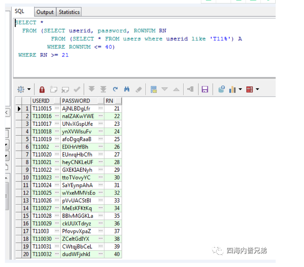 SELECT * FROM (SELECT userid,password,ROWNUM RN FROM (SELECT * FROM users where userid like 'T11%') A WHERE ROWNUM <= 40)WHERE RN >= 21