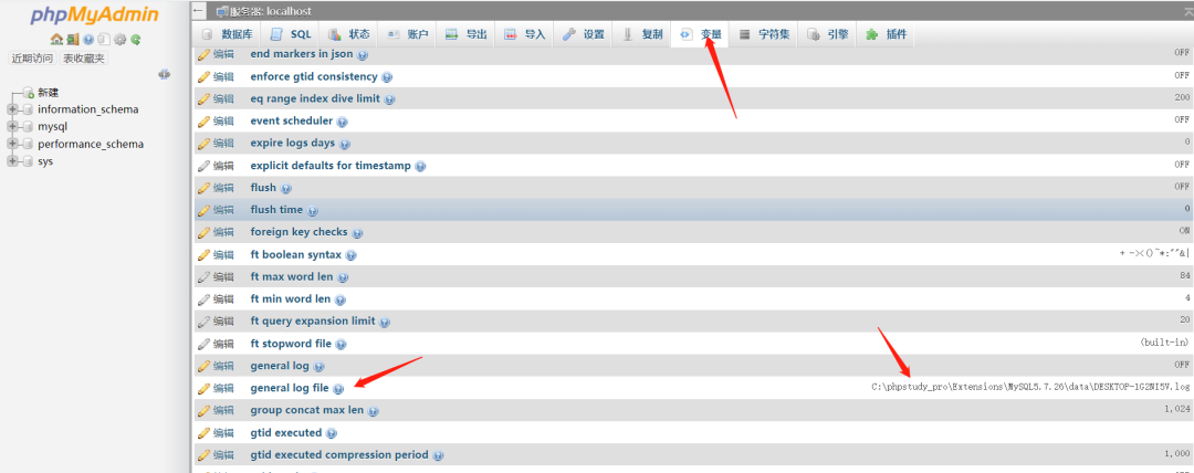 在phpmyadmin中,我们可以利用log变量来猜测网站的绝对路径