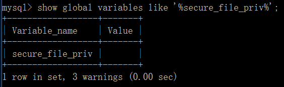 mysql> show global variables like '%secure_file_priv%';+------------------+-------+| Variable_name | Value |+------------------+-------+| secure_file_priv | NULL |+------------------+-------+