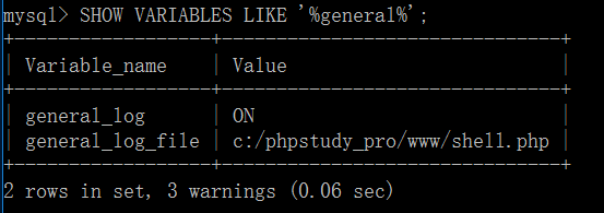 mysql> set global general_log = "ON"; #开启general_logmysql> set global general_log_file='c:/phpstudy_pro/www/shell.php'; #修改general_log_file路径