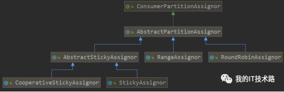 消费者重平衡分配策略是通过接口定义的:ConsumerPartitionAssignor,通过该接口我们可以看到这个接口的具体实现类如下: