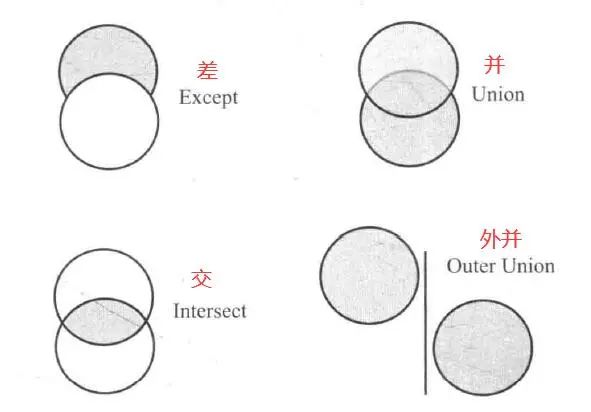 SQL纵向查询(串接)类型—四种,EXCEPT(差)、INTERSECT(交)、UNION(并)、外并(OUTER UNION)。前三种各数据集结构应一致,外并则在结构不一致时保留所有行/列,类似SET语句。
