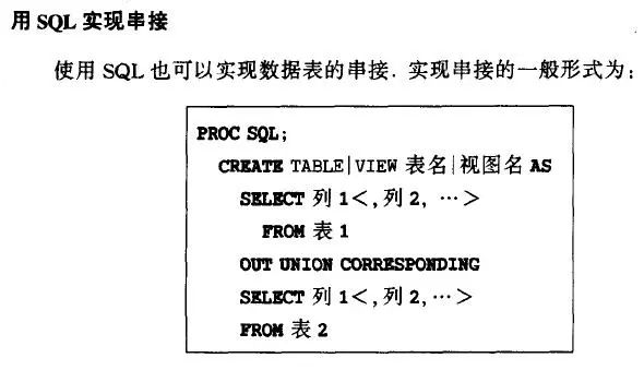 *串接数据集 外并接——outer union;proc sql;title "并接数据集——直接串接,保留所有行/列";create table outer_union as /*建立外并接数据集outer_union*/select * from a18_1 /*选择数据集a18_1所有变量*/outer union corr /*在a18_1基础上外并接a18_2_num*/select * from a18_2_num(rename=(ht=height)) /*选择数据集a18_2_num所有变量并重命名变量ht为height*/outer union corr /*在a18_1与a18_2_num外并接基础上,继续外并接a18_3*/select * from a18_3(rename=(wt=weight)); /*选择数据集a18_3所有变量并重命名变量wt为weight*/quit;