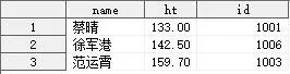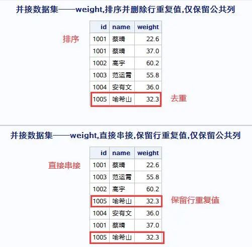 *串接数据集 并接——union;proc sql;title "并接数据集——height,排序并删除行重复值,仅保留公共列";create table union_ht as *建立并接数据集union_ht*/select * from a18_1 /*选择数据集a18_1所有变量*/union corr /*基于变量名并接数据集a18_1 a18_2_num,排序去重*/select * from a18_2_num(rename=(ht=height)); /*选择数据集a18_2_num所有变量并重命名变量ht为height*/quit;proc sql;title "并接数据集——height,直接串接,保留行重复值,仅保留公共列";create table union_ht_all asselect * from a18_1union corr all /*基于变量名并接数据集a18_1 a18_2_num,不排序不去重*/select * from a18_2_num(rename=(ht=height));quit;proc sql;title "并接数据集——weight,排序并删除行重复值,仅保留公共列";create table union_wt asselect * from a18_1union corrselect * from a18_3(rename=(wt=weight));quit;proc sql;title "并接数据集——weight,直接串接,保留行重复值,仅保留公共列";create table union_wt_all asselect * from a18_1union corr allselect * from a18_3(rename=(wt=weight));quit;