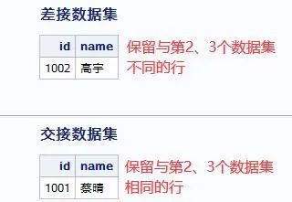 *串接数据集 差接——except;proc sql;title "差接数据集";create table except as *建立差接数据集except*/select a.id,a.name from a18_1 as a *从数据集a18_1选择变量id name,设置数据集a18_1别名为a*/except *在a18_1基础上差接a18_2_num*/select b.id,b.name from a18_2_num as b *从数据集a18_2_num选择变量id name,设置数据集a18_2_num别名为b*/except *在a18_1与a18_2_num差接基础上,继续差接a18_3*/select c.id,c.name from a18_3 as c; *从数据集a18_3选择变量id name,设置数据集a18_3别名为c*/quit;*串接数据集 交接——intersect;proc sql;title "交接数据集";create table intersect asselect a.id,a.name from a18_1 as aintersect *在a18_1基础上交接a18_2_num*/select b.id,b.name from a18_2_num as bintersect *在a18_1与a18_2_num交接基础上,继续交接a18_3*/select c.id,c.name from a18_3 as c;quit;