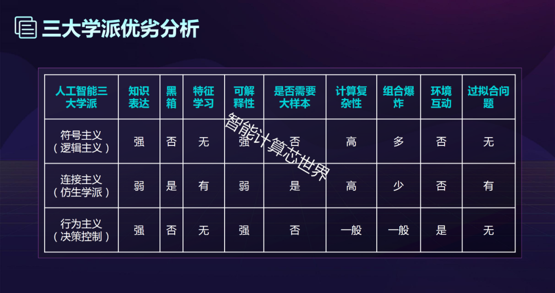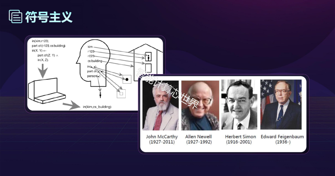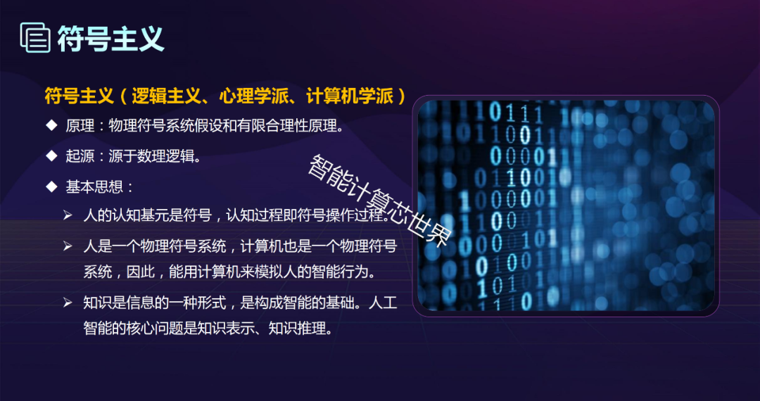 原理:物理符号系统假设和有限合理性原理。 起源:源于数理逻辑。 基本思想:人的认知基元是符号,认知过程即符号操作过程。人是一个物理符号系统,计算机也是一个物理符号系统,因此,能用计算机来模拟人的智能行为。知识是信息的一种形式,是构成智能的基础。人工智能的核心问题是知识表示、知识推理。