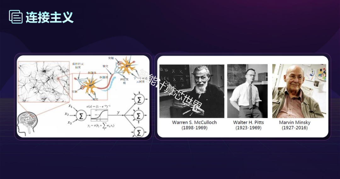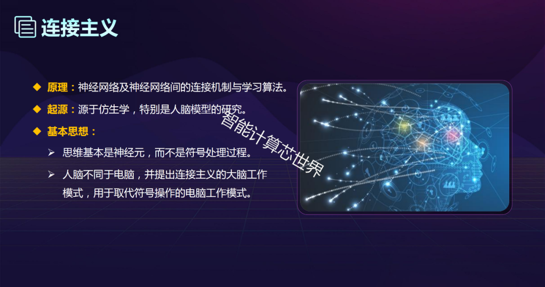 基本思想:思维基本是神经元,而不是符号处理过程。人脑不同于电脑,并提出连接主义的大脑工作模式,用于取代符号操作的电脑工作模式。