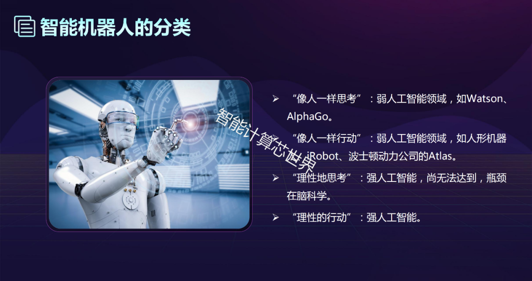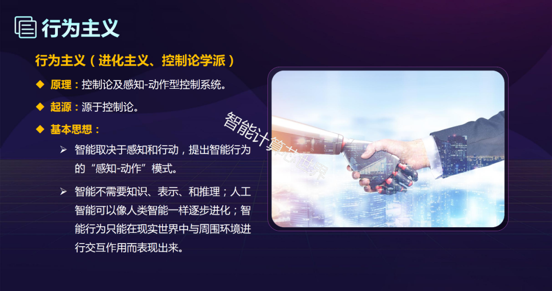 基本思想:智能取决于感知和行动,提出智能行为的“感知-动作”模式。智能不需要知识、表示、和推理;人工智能可以像人类智能一样逐步进化;智能行为只能在现实世界中与周围环境进行交互作用而表现出来。