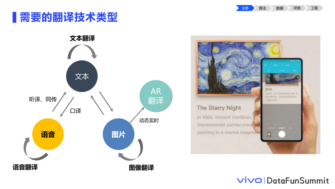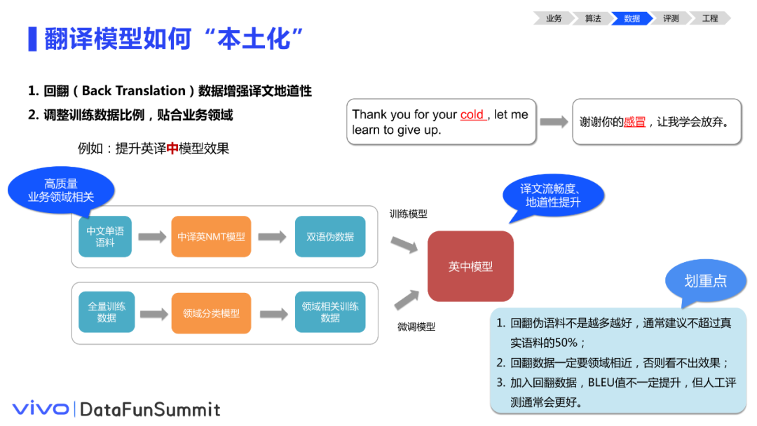 本文题目为从技术到体验:vivo机器翻译落地实践。我们将结合翻译能力落地的实战经验,围绕翻译能力落地时需要考虑的方方面面展开介绍,同时分享一些快速提升翻译质量的小技巧,主要内容包括:① 做算法前先了解你的业务(业务);② 算法不仅是NMT模型(算法);③ 数据决定了翻译效果的上限(数据);④ 科学评测指引优化方向(评测);⑤ 工程工作同样很重要(工程)。
