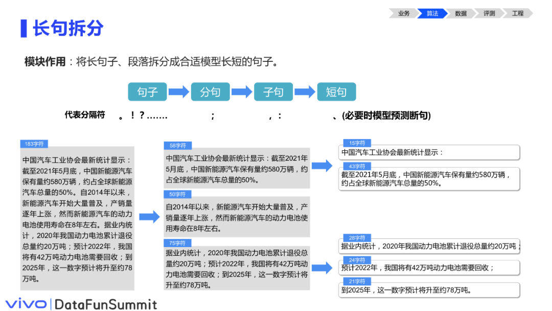 具体操作时,可以简单地通过标点等分隔符作为一个拆分。当遇到一些极端的情况,比如句子很长且没有标点时,可以训练一个断句模型来预测句子中自然停顿的地方进行合理的拆分。
