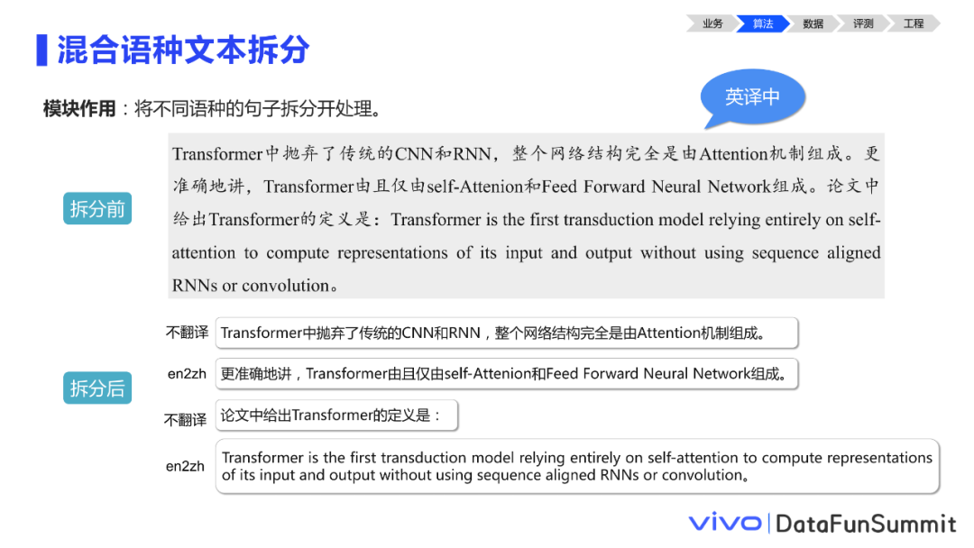 举个例子,这里整段的第一个句子里仅包含个别英文单词和缩写,这种的话,我们可能倾向于它是不拆分的。而像最后一个句子,冒号后是英文,而冒号前是中文为主体的,这样我们就会识别出这个边界,做一个切分。其实混合语种文本拆分和长句拆分是配套使用的,它们是共同开发的。