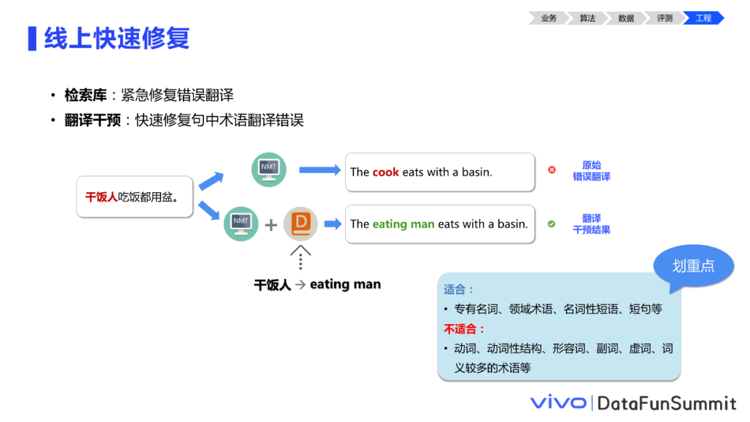 另外,在上线的时候我们也要考虑线上紧急badcase修复。主要有两个方法,一个是检索库,另一个是翻译干预。